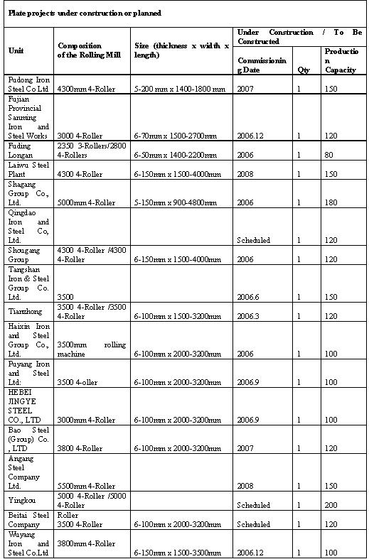 In the 2nd half of last year, up to 12 plate rolling mills were built and put into operation. Besides, there are several plate rolling mills currently being constructed. The average production capability of the newly-built rolling mills is over one million metric tons. When the modernization of older production lines is added, the total increase in production capacity nears 15 million metric tons. Of this 15 million metric tons, only less than three million metric tons was added in the first half of 2006, while the major portion was added in the second half of that year.
