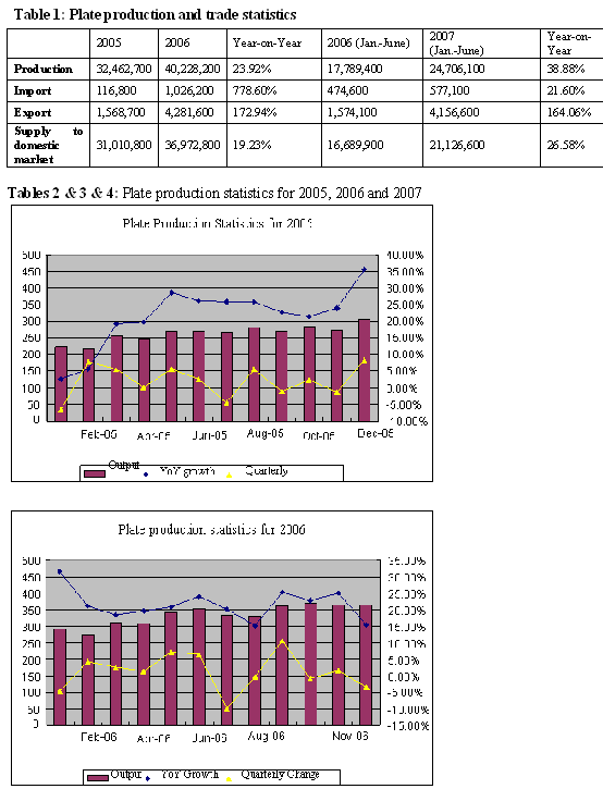 Last year, the plate production capacity saw a concentration. In 2006, 40.2282 million metric tons of plates were produced, up 7.76 million metric tons or 23.92 percent compared to the previous year (32.4627 million metric tons). Influenced by the sharp increase in plate production, the whole trend for the 2nd half of 2006 was weak and the price fluctuated at a low level around RMB 3,500/mt. According to the statistics, cumulative production from January to June 2007 is 24.7061 million metric tons, up 38.88 percent compared with 17.7894 million metric tons produced during the same period of last year. According to the comparison in the following table, production in the 2nd half of 2006 reached 22.4388 million metric tons, while production in the 1st half of 2007 is only 2.2673 tons higher, indicating very little growth. As the rapid increase in the release of supply to the domestic market in the 2nd half of 2006 is almost over, plate prices have become firmer this year.