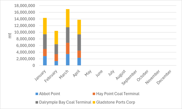 In April this year, coal exports from Australian ports Hay Point, Dalrymple Bay Coal Terminal (DBCT), Abbot Point and Gladstone located in the state of Queensland were down by 12.4 percent year on year and decreased by 18.8 percent month on month to 13.7 million mt, according to data released by North Queensland Bulk Ports Corporation and Gladstone Ports Corporation.