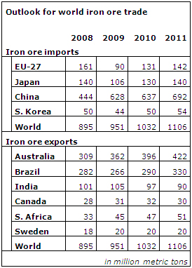In 2010, world trade of iron ore is forecast to increase by nine percent to one billion metric tons, according to a report released by the Australian Bureau of Agricultural and Resource Economics (ABARE). This growth reflects increased steel production in China outpacing growth in domestic iron ore supply, and increased imports supporting recovery in steel production in many developed economies. In 2011, world trade of iron ore is forecast to increase by a further seven percent to 1.1 billion metric tons. The majority of increased trade in 2010 and 2011 is expected to be supplied by Australia and Brazil.