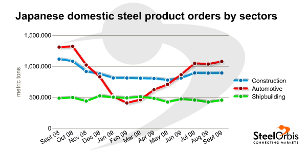 According to the data released by the Japan Iron and Steel Association, steel product orders, including specialty steels, booked by domestic steel consuming sectors in September this year amounted to 7.12 million metric tons, increasing by nine percent compared to August and down 9.69 percent year on year.