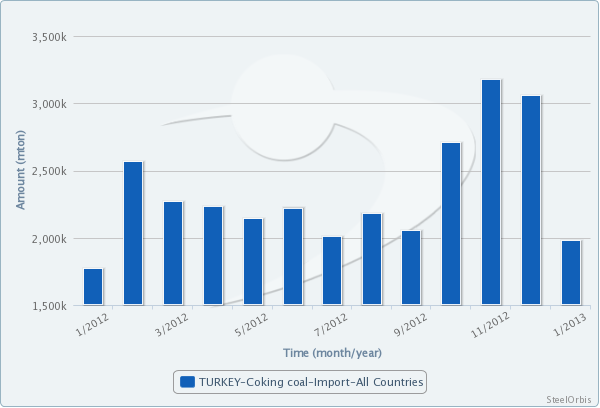 According to the data provided by the Turkish Statistical Institute (TUIK), in January this year Turkey's coking coal imports rose by 11.9 percent year on year but decreased to the lowest level recorded since January last year to 2 million mt. The January import volume was down 35.3 percent from December 2012, when the country's coking coal imports had exceeded 3 million mt. In the fourth quarter of 2012, Turkey's coking coal imports had increased as can be seen in the chart below.