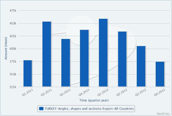 Meanwhile, in December last year Turkey's total angle, shape and section exports came to 129,240 mt, falling 7.15 percent compared to the previous month and down 22 percent compared to December 2011. In 2012, the country's total angle, shape and section exports came to 1.66 million mt, falling by 0.7 percent compared to 2011. On quarter-on-quarter basis, Turkey's exports of the products in question moved on a declining trend in the last three quarters of 2012.