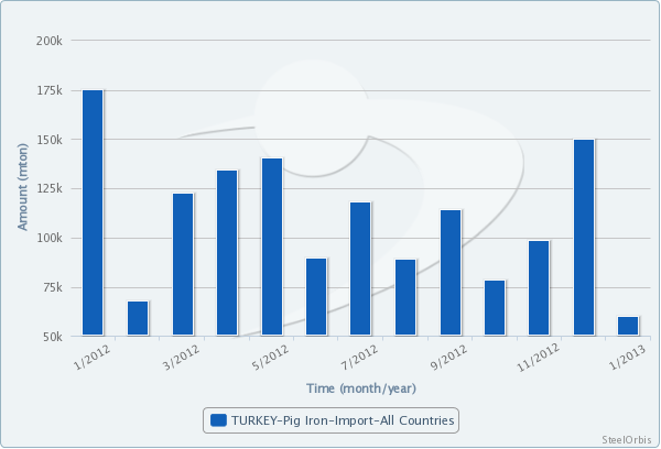 According to the data provided by the Turkish Statistical Institute (TUIK), in January this year Turkey's pig iron imports amounted to 59,921 mt, down sharply compared to the 149,563 metric tons recorded in the previous month and the 175,148 mt recorded in the same month of 2012, and constituting the lowest volume since May 2011. In 2012, Turkey's pig iron imports had amounted to 1.4 million metric tons, increasing by 21 percent compared to 2011 and hitting the highest historical annual level.