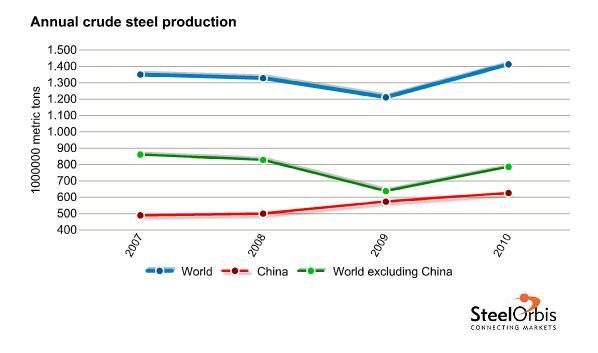 According to the data released by the World Steel Association (worldsteel) on January 21, global crude steel output in 2010 amounted to 1.414 billion metric tons, increasing by 15 percent year on year and constituting a new record for global crude steel production.