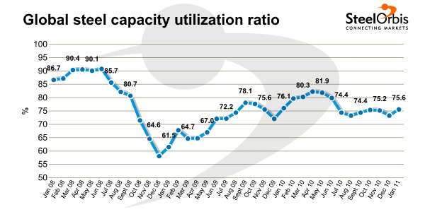 In January, the world crude steel capacity utilization rate of the 64 countries surveyed was 75.6 percent, up from 73.3 percent in December last year and down 0.4 percentage points from January 2010.