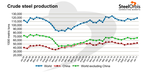 In January, China's crude steel production totaled 52.8 million metric tons, a slight increase of 0.5 percent, while Japan produced 9.66 million metric tons of crude steel, up 10.7 percent, both compared to the same month last year. South Korea showed an increase of 24.2 percent from January 2010, producing 5.63 million metric tons of crude steel in January this year. India, on the other hand, produced 5.61 million metric tons of crude steel in the given month, down 0.6 percent year on year.