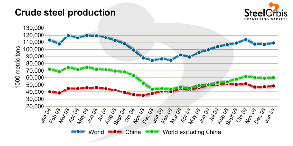 On February 22, the World Steel Association (worldsteel) has announced that world crude steel production in January this year amounted to 108.89 million metric tons, increasing by 25 percent year on year and up 1.8 percent compared to December 2009.