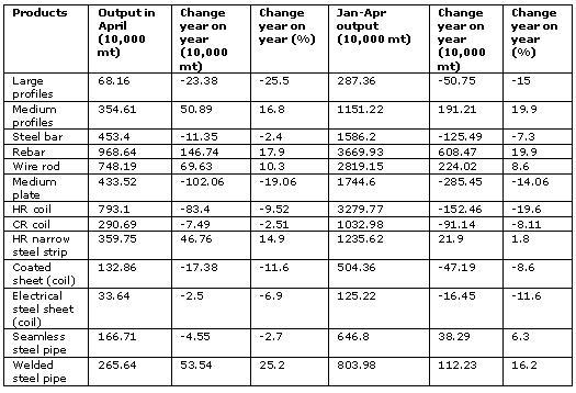 The breakdown of China's finished steel production in April according to the various products is as follows:
