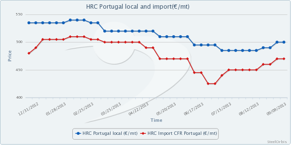 SteelOrbis has learned from market sources that demand has failed to improve in the Portugese flat steel market, where higher demand was expected after the summer holdiay and where spot inventories increased in line with this expectation. Prices have increased by €30/mt ($40/mt) as compared to the period before the holiday, while a recovery is observed in profit margins. However, price decreases are expected in the Portugese flat steel market due to slack demand.