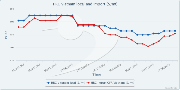 HRC prices in the Vietnamese domestic market are still at $560-565/mt ex-warehouse, while CRC prices stand at $680-685/mt ex-works. Meanwhile, rerolling quality HRC of 2 mm thickness is now being quoted at $585-595/mt ex-warehouse.