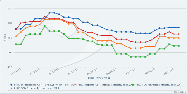 The most recent flat steel import offers and transaction levels in Turkey were as follows: Russian hot rolled coil (HRC) offers to Turkey were at $565-585/mt CFR, while Russian cold rolled coil (CRC) offers stood at $640-660/mt CFR. Meanwhile, Romanian HRC offers for the same destination were standing at $580-590/mt CFR and Romanian CRC offers were at the level of $690-700/mt CFR. In addition, ex-Ukraine HRC offers for Turkey were in the range of $535-540/mt CFR, while Ukrainian CRC offers to Turkey stood at $620-625/mt CFR.