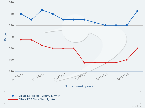 SteelOrbis has been informed by market players that billet prices in the Turkish domestic market are currently ranging at $525-540/mt ex-works, indicating an increase of $10-15/mt since last week. Despite no recovery on the demand side in the Turkish billet spot market, increased transaction price levels for import scrap and Turkish mills' upward price revisions for export finished steel products have allowed billet prices to move up.