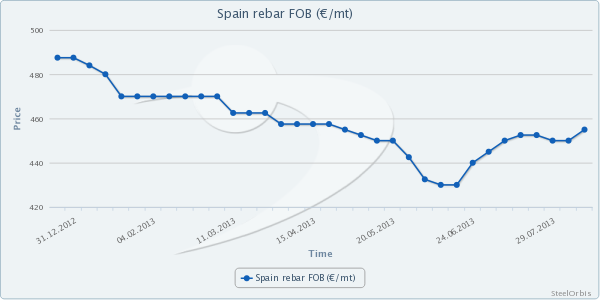 Markets sources state that ex-Spain rebar offers have indicated an increase of €5/mt ($7/mt) over the last week to €450-460/mt ($603-616/mt) FOB.