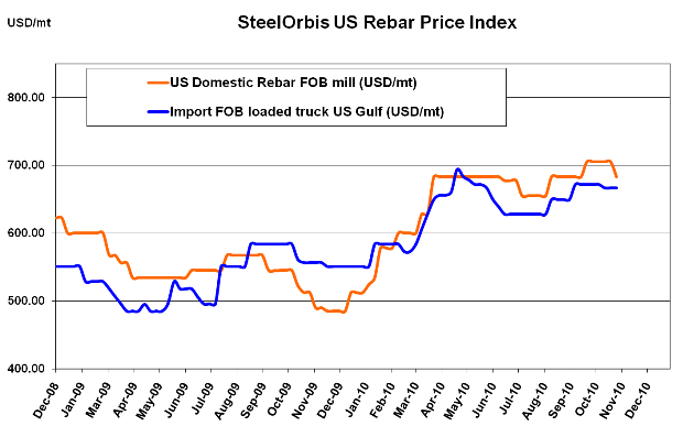 It will be interesting to see how domestic rebar mills react to the various scenarios swirling in the market regarding November scrap pricing. If shredded scrap reverts back to September prices by increasing $30/lt next month, rebar mills would likely have a difficult time passing off any sort of price increase, but it might help to firm up spot prices closer to current asking prices. But if scrap drops as some others predict, even by a slight $10-$20/lt, it could significantly destabilize an already weak market.