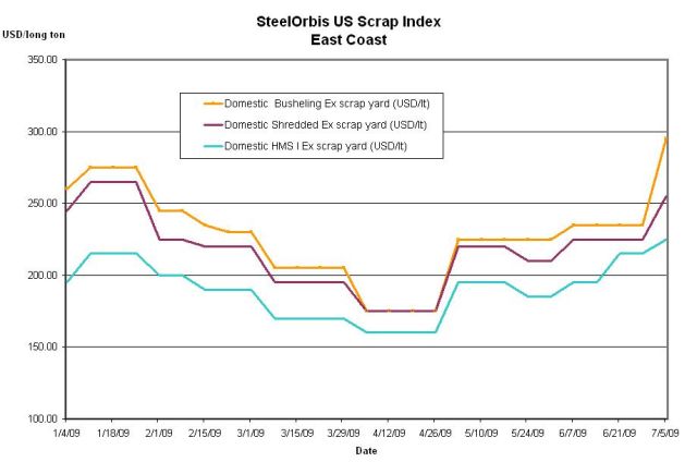 SteelOrbis has been tracking US scrap prices very closely and reported on a June increase before other publications reflected the new transaction prices. To recap, after US domestic scrap prices increased by about $43 /long ton ($42 /mt) in the first week of May and by another approximately $10 /long ton in early June (see SteelOrbis' June15 2009 report ). SteelOrbis also predicted a strong increase by late June (see SteelOrbis' June 29 report ) and the prices have continued to rise in July.